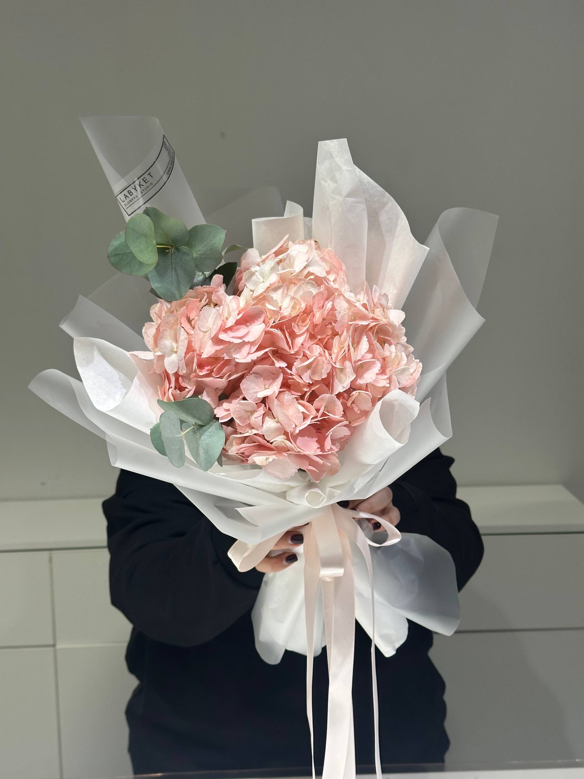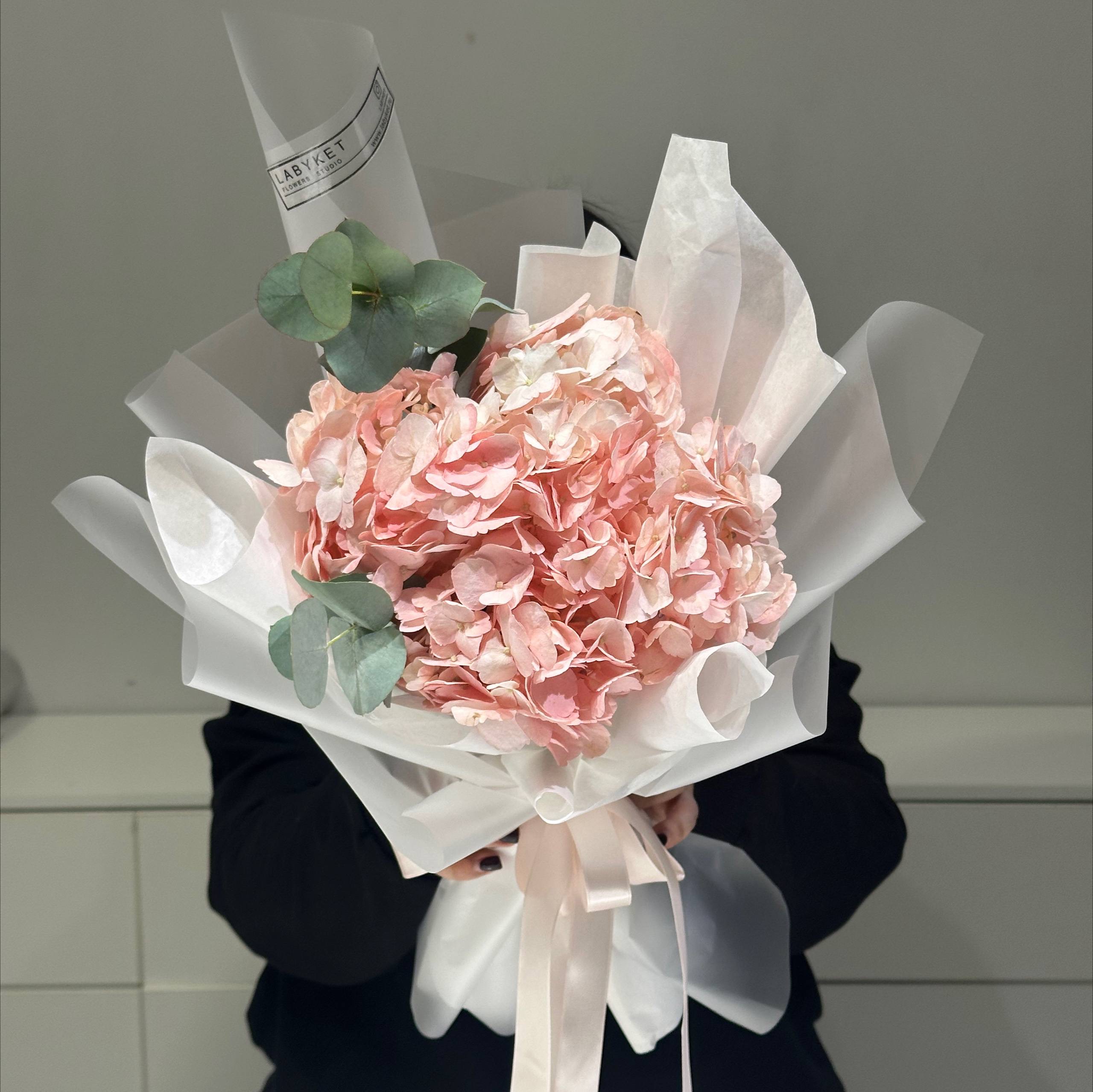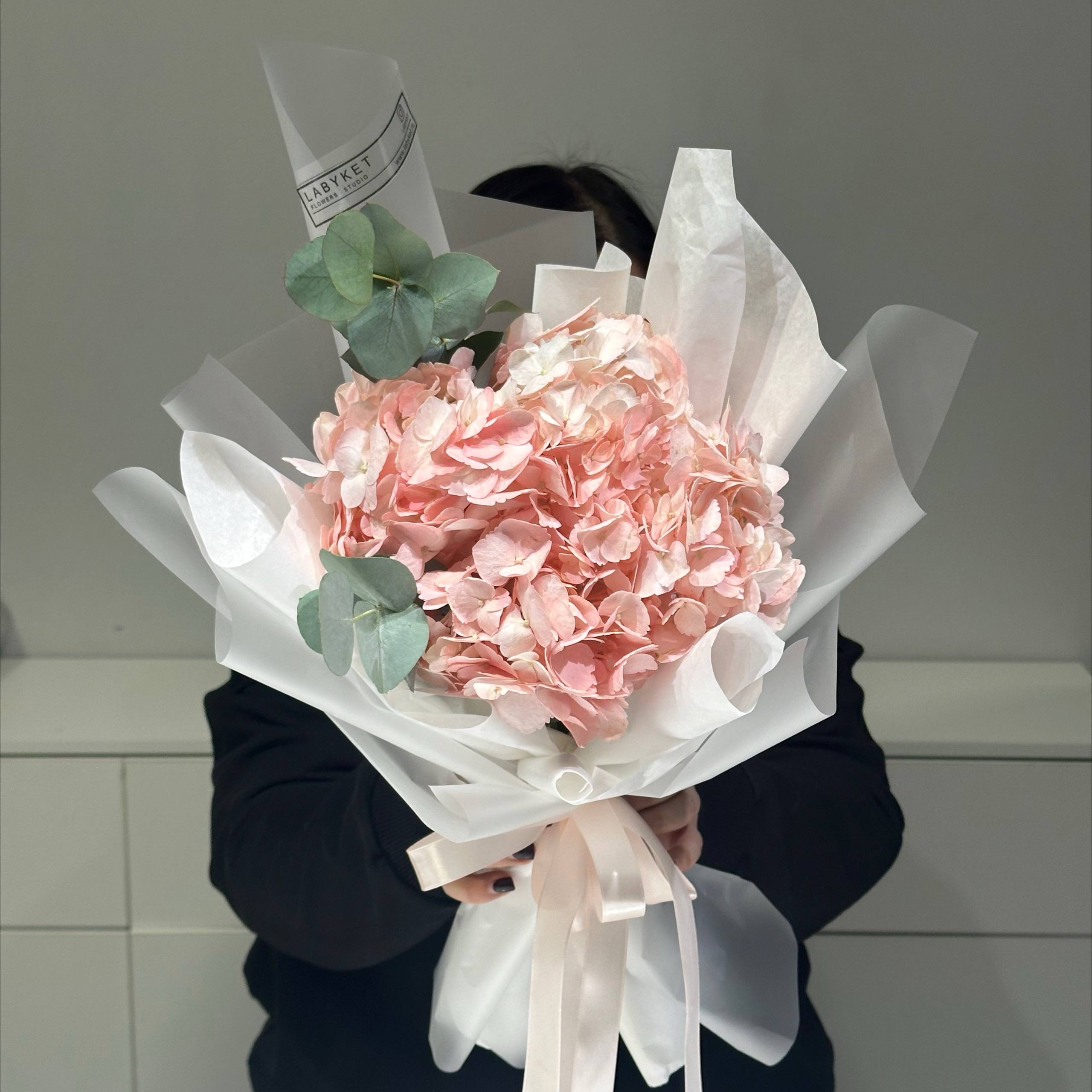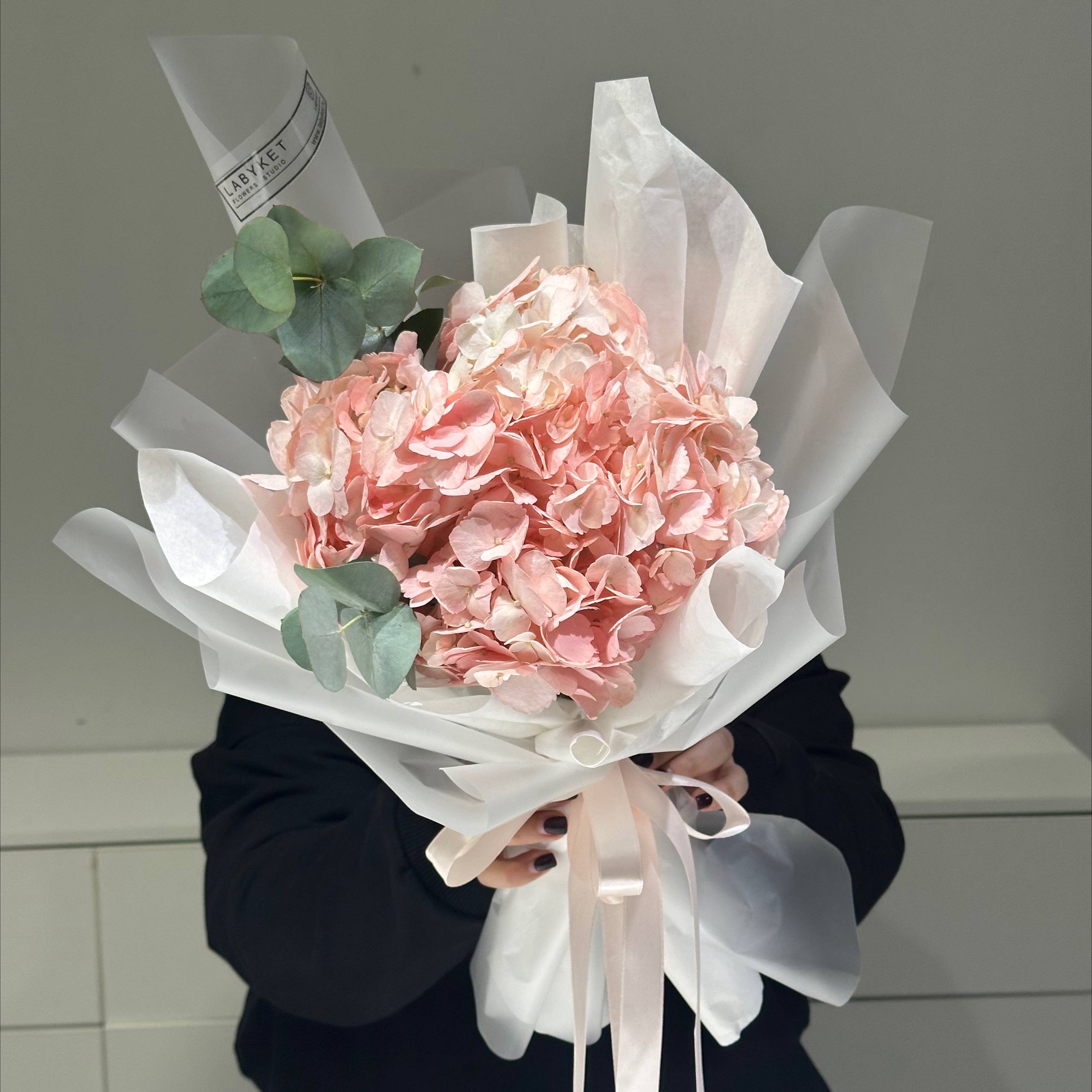 Монобукет гортензия с эвкалиптом в розовом цвете
